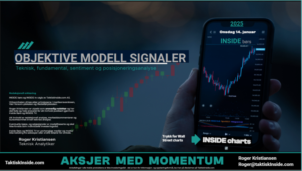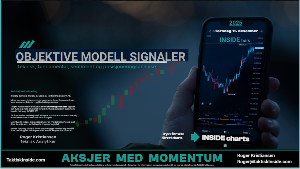 Her får du kontinuerlige oppdateringer på hvordan markedet kan tolkes ut fra tekniske modeller, sentiment og volum – analysemetoder som brukes av institusjoner og profesjonelle investorer.